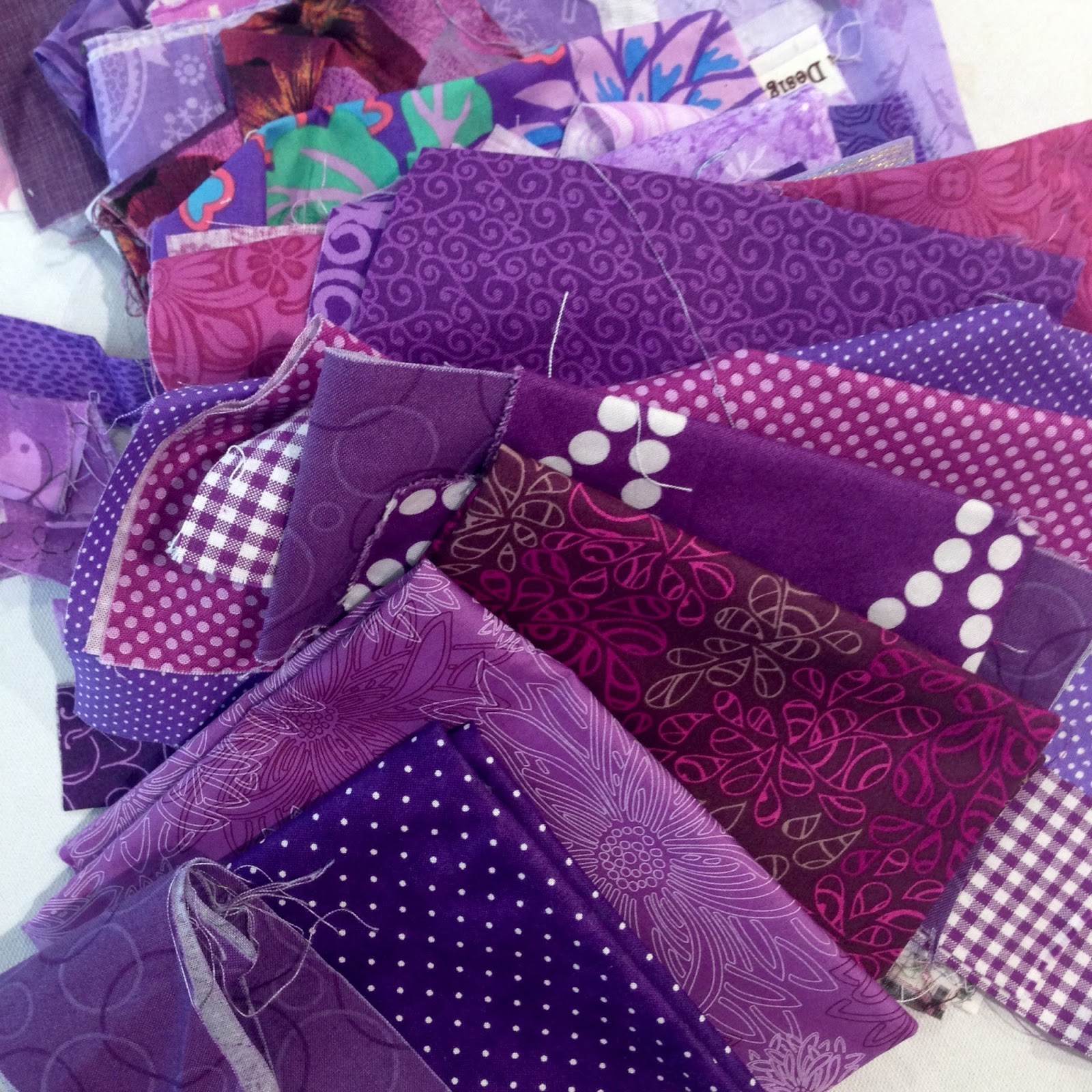Sewing has been happening here in a random sort of way. I'm jumping among several WIPs - AKA not finishing anything. The current project that has my attention is the Slopes quilt I stopped working on last May. It's a pattern in Amanda Jean's book No Scrap Left Behind, and is made from string scraps. I stopped working on it because I was running low on color scraps, especially purple. However, thanks to a generous offer from Amanda Jean (CrazyMomQuilts) herself, she sent a bunch of purples she had collected.