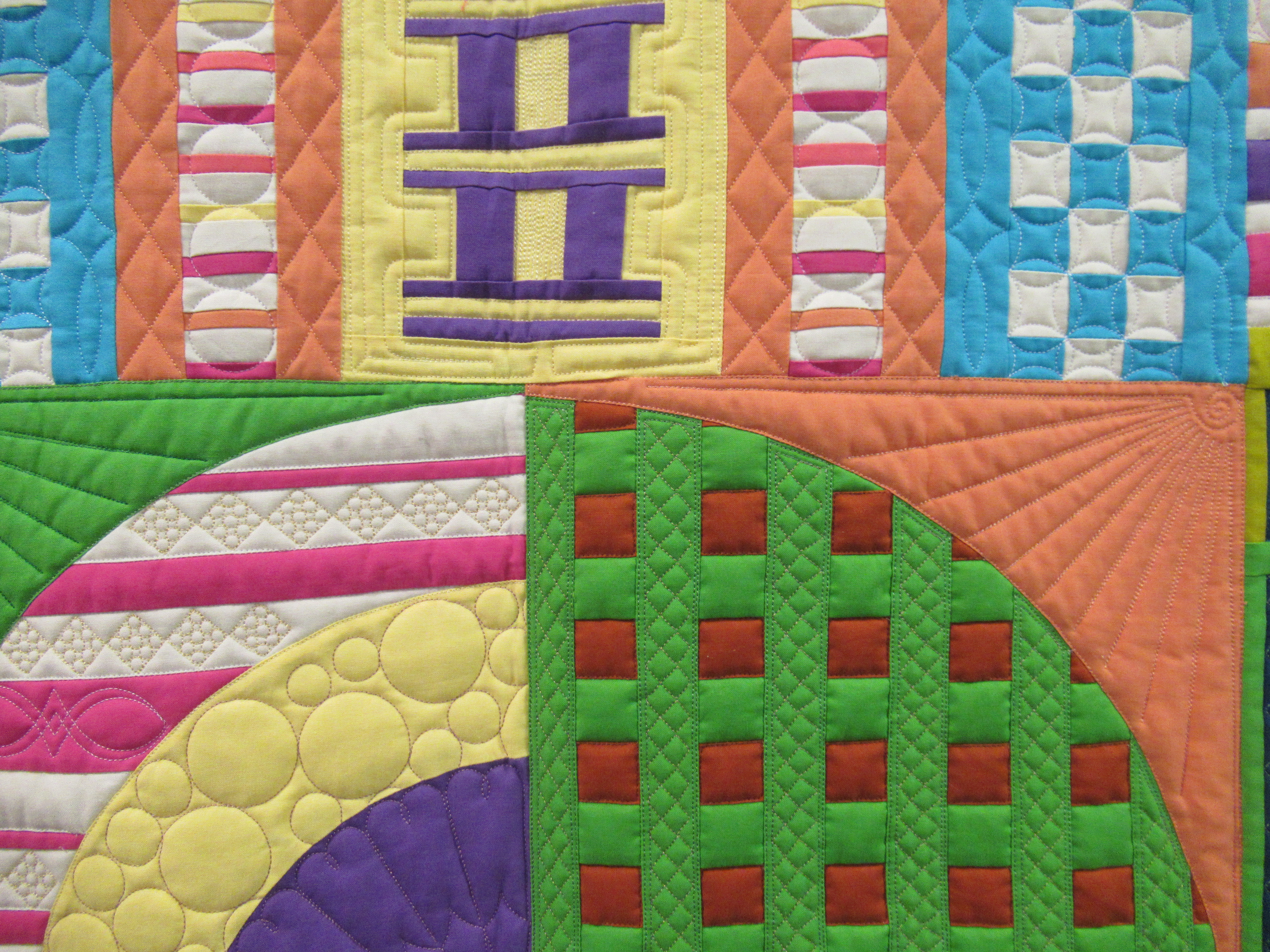 A white-glove volunteer let me see the back of Spin Cycle, and it's impressive. Maria uses a heavier-weight quilting thread in the bobbin than on top, and quilts every shape twice, so there's no need to bury thread tails. Interesting, isn't it?