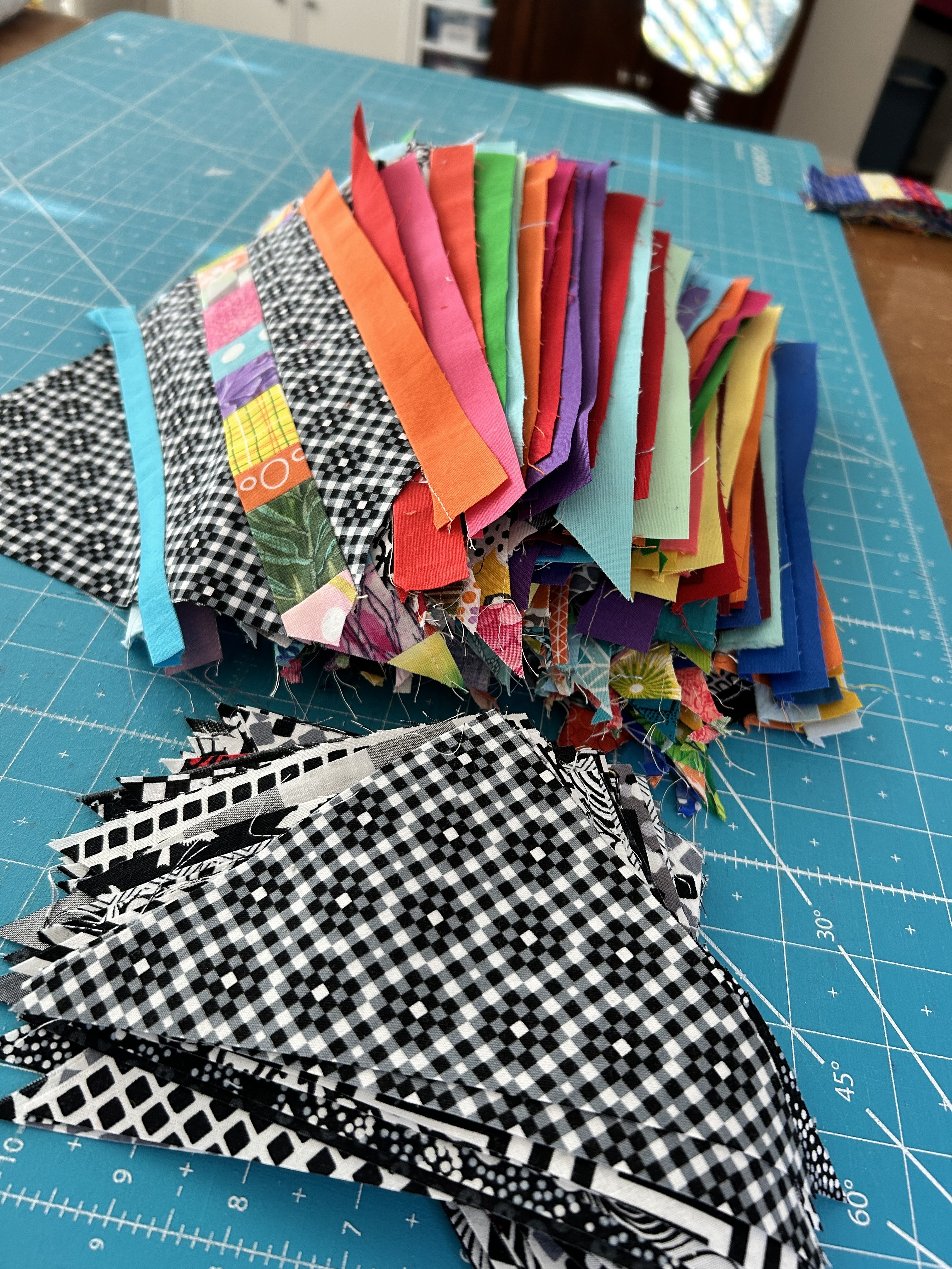 More than 6 yards of fabric was used in the piecing of a black and white version of the Diagonal Scrap Quilt; it's 71½" X 79". (Pattern by Maryline of @Mary_and_Patch). The top is still on the design wall, waiting for me to decide whether to succumb to the purchase of a wideback, for backing, or spend hours piecing a backing from my ever-dwindling - and challenging-to-make-a-backing stash of prints.